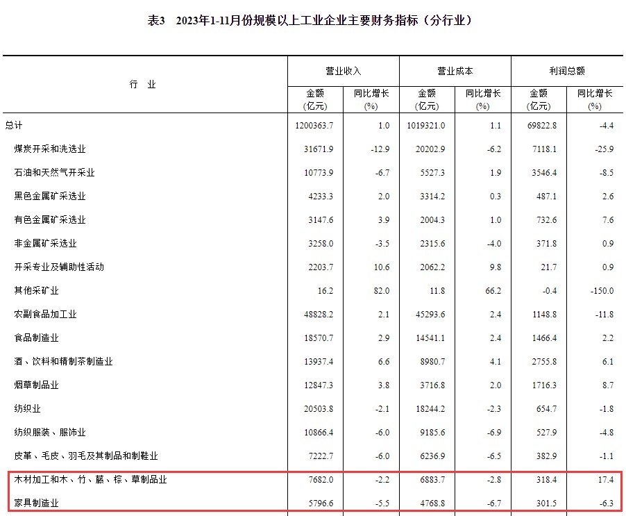 木材加工和木、竹、藤、棕、草制品业方面,1-11月营业收入为7682亿元,同比下降2.2%;营业成本6883.7亿元,同比下降2.8%;利润总额318.4亿元,同比增长17.4%。