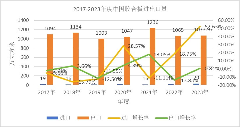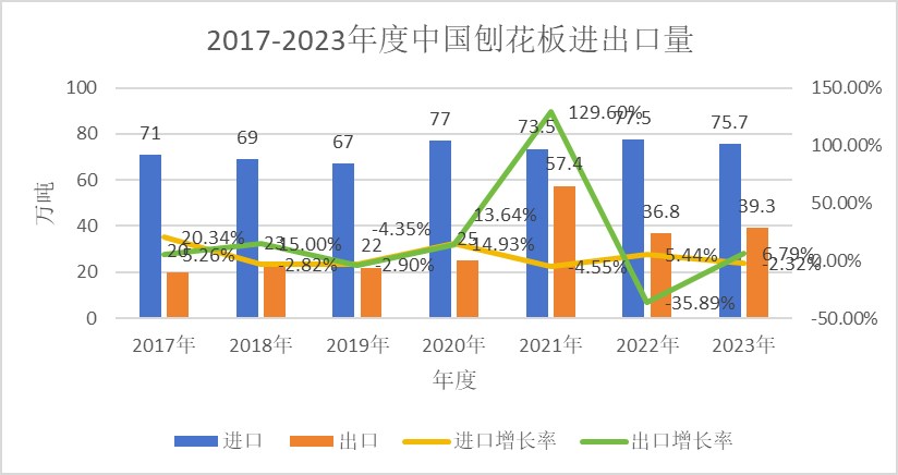 2023年,中国人造板进出口总量为1587.75万立方米(折算),同比上升2.05%,进出口总额68.67亿美元,同比下降13.21%。