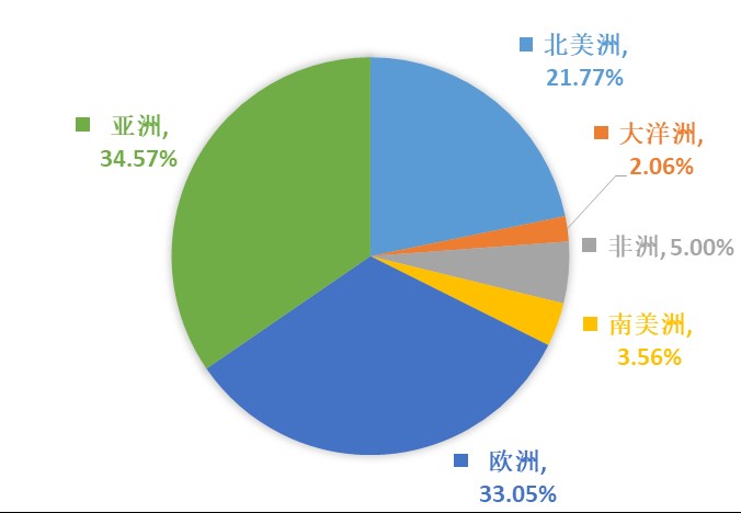 人造板机械出口排名前三的地区是亚洲、欧洲和北美洲,分别占出口总额的34.57%、33.05%、21.77%。向美国、欧盟、东盟三大贸易伙伴出口额,分别占出口总额的18.96%、26.81%、18.66%。