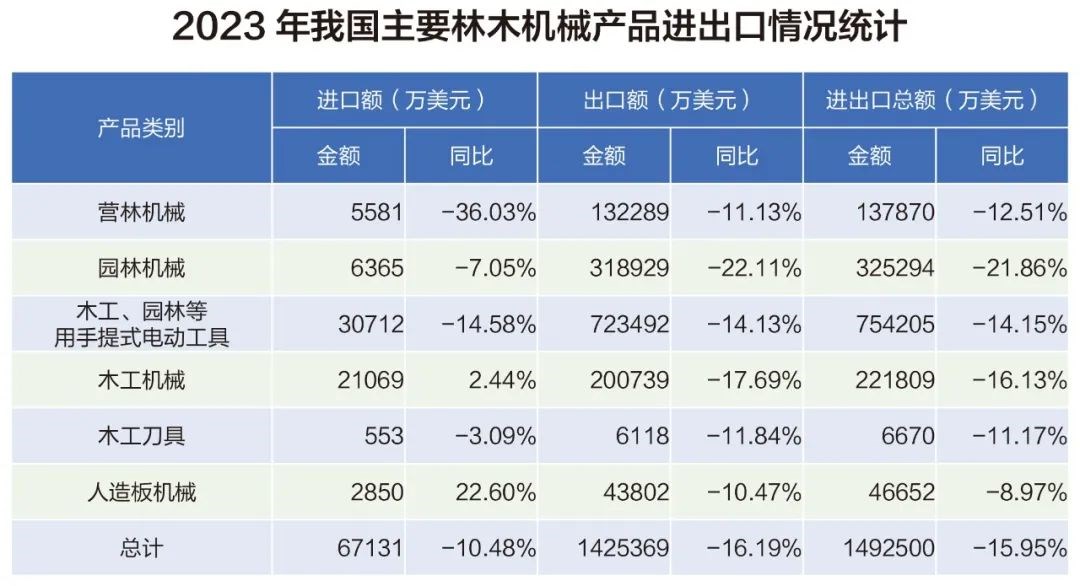 据海关数据统计,2023年我国主要林木机械包括营林机械(含农林、园艺用设备)、木工、园林等用手提式电动工具、园林机械、木工机械、木工刀具和人造板机械等产品进出口总额为149.2亿美元。其中,进口额6.71亿美元,出口额142.5亿美元。