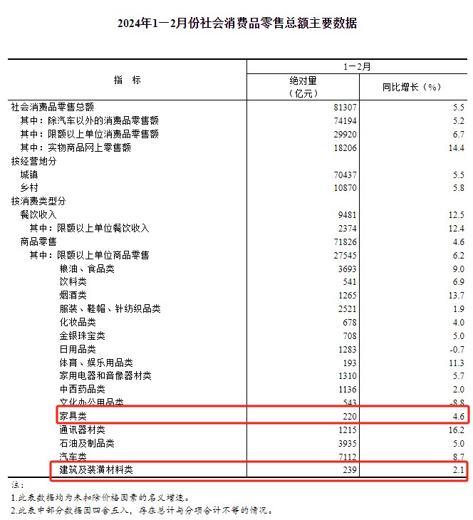 3月18日,国家统计局发布2024年1-2月国民经济运行情况。数据显示,今年1-2月份,社会消费品零售总额81307亿元,同比增长5.5%。其中,家具类零售总额为220亿元,同比增长4.6%;建筑及装潢材料类零售总额为239亿元,同比增长2.1%。
