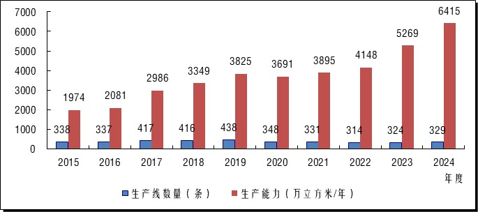 2024年度,全国建成投产48条刨花板生产线,新增生产能力1541万立方米/年,为中国刨花板产业发展历史上年度投产总量最 大的一年。