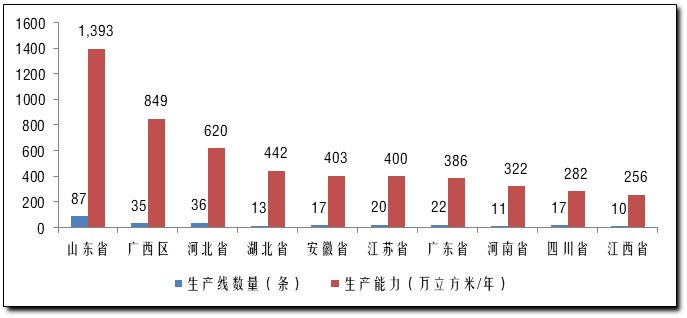 广西区生产能力大幅增长达到849万立方米/年,占全国生产能力的13.2%,排位保持第二。