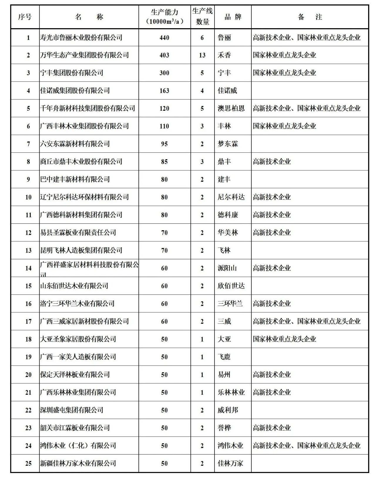 生产能力50万立方米/年以上刨花板类产品生产企业及企业集团