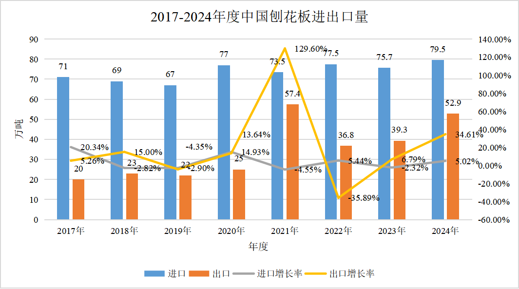 2024年,中国人造板进出口总量为1998.9万立方米(折算),同比上升25.89%,进出口总额78.55亿美元,同比上升14.39%。