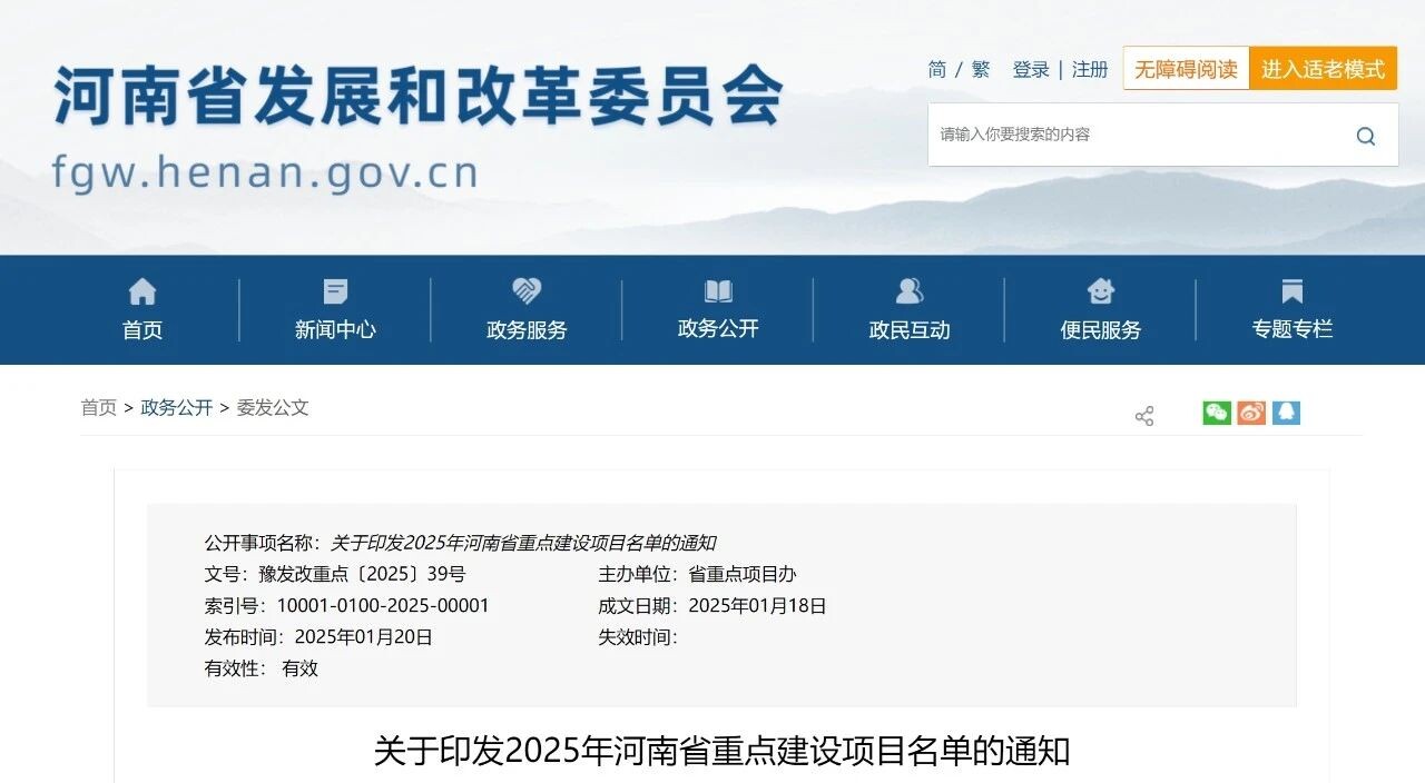 河南省发展改革委印发2025年河南省重点建设项目名单,明确2025年省重点项目1037个、总投资约3.1万亿元,力争年度完成投资1万亿元左右。项目涵盖创新驱动能力提升、基础设施建设、新型基础设施建设、产业转型发展、绿色低碳转型、民生社会事业改善等六大领域。