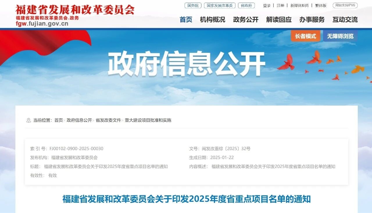 福建省发展和改革委员会印发2025年度省重点项目名单,确定2025年度省重点项目1550个,总投资4.3万亿元,年度计划投资7150亿元。其中,省在建重点项目1345个,省预备重点项目205个。