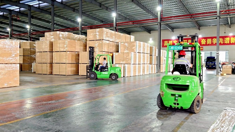 10月26日,桂平市广西宝尔康新型材料有限公司仓库车间内,机械轰鸣,数名工人戴着防护手套正忙着摆铺坯板、将坯板热压成型、裁边包装、用叉车将板材装上货车,准备运往全国各地。