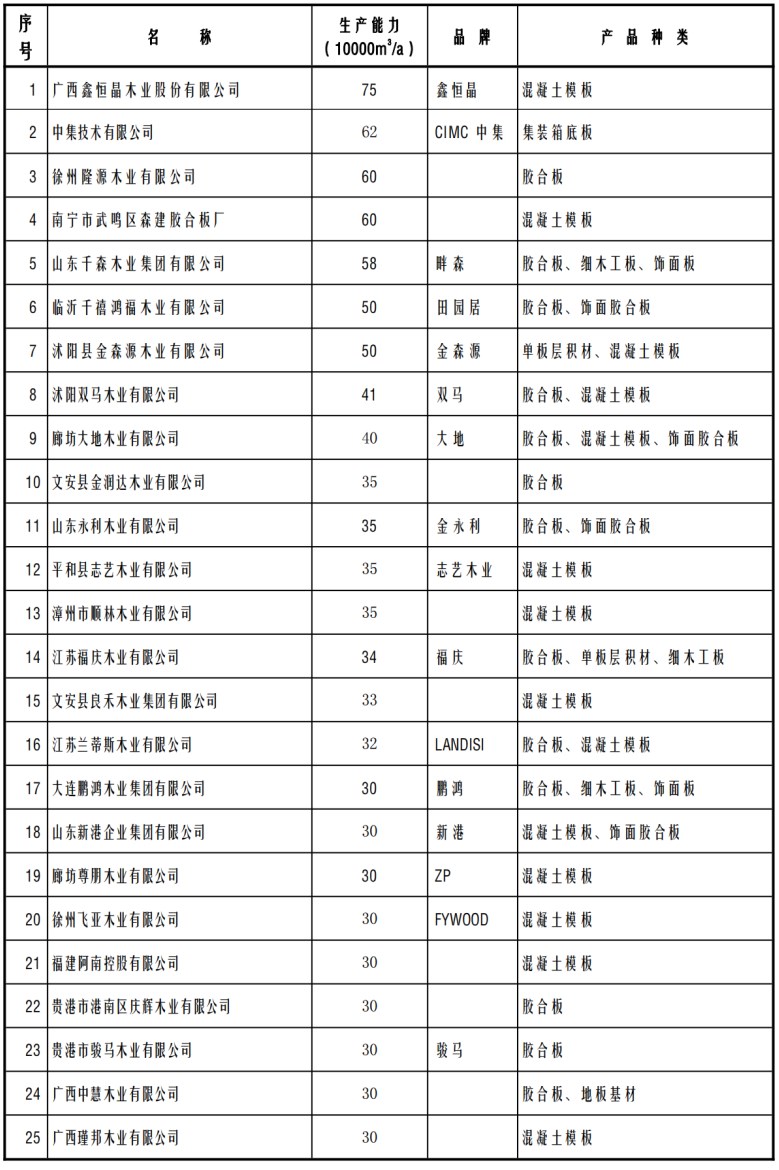 生产能力30万立方米/年以上胶合板类产品生产企业及企业集团