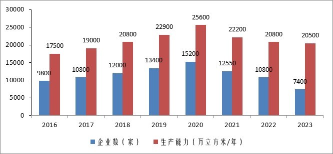 2023年底,全国保有胶合板类产品生产企业7400余家,总生产能力约2.05亿立方米/年,在2022年底基础上进一步降低1.4%;企业平均生产能力约2.77万立方米/年·家。