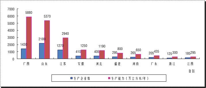 全国胶合板类产品生产企业分布在28个省市区,其中有5个省区、5个地市、3个区县胶合板类产品年生产能力超千万立方米。