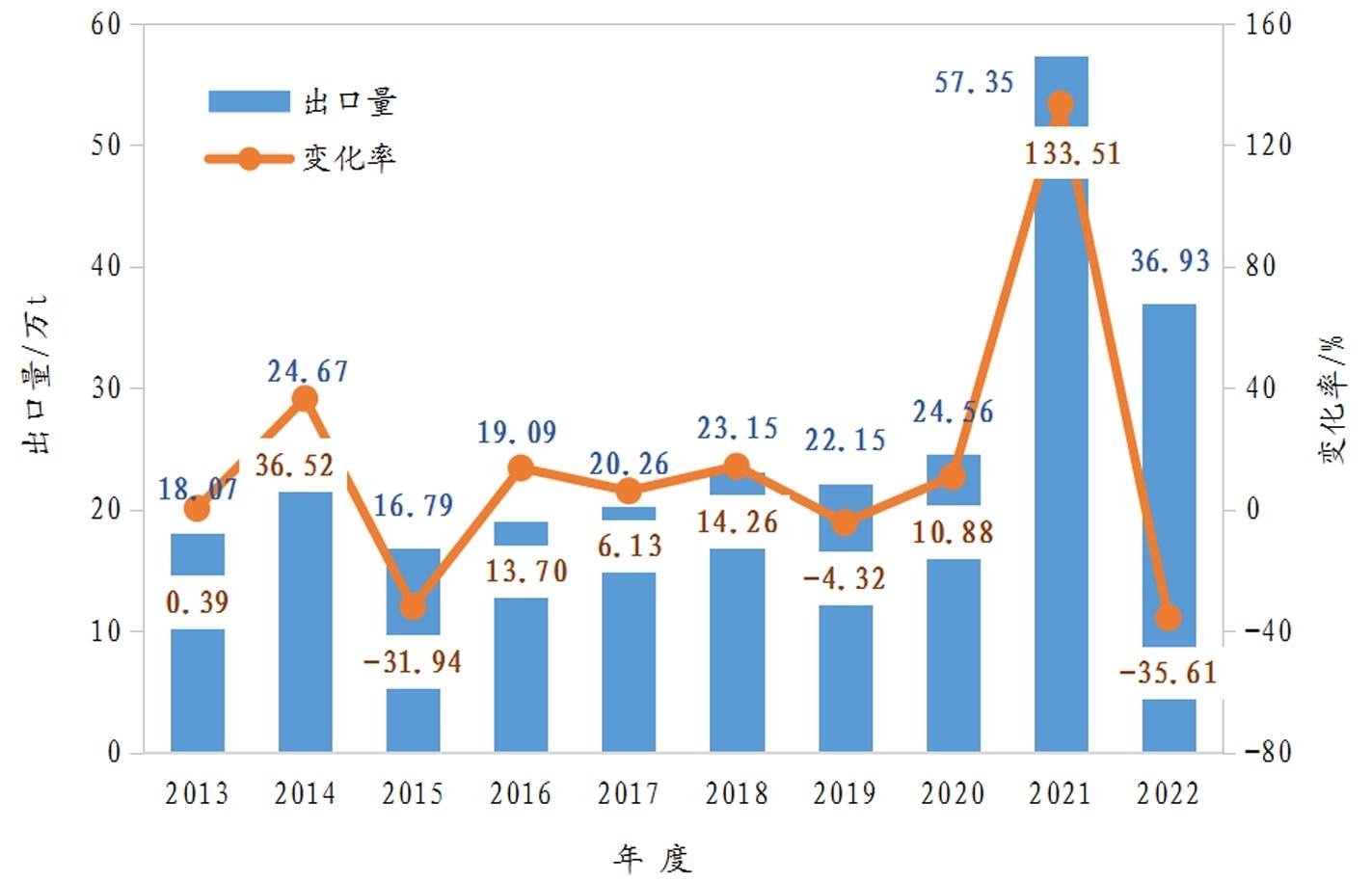 中国刨花板的出口量低于进口量,近10年(2013—2022)中国刨花板出口量及变化率见图5。2013—2020年中国刨花板平均年出口量约20万t,2021年刨花板出口量高达57.35万t,是近10年的一次爆发式增长,主要是定向刨花板出口量大增,可能是因为当时国外新冠肺炎疫情导致的工厂开工率不足,且人们出行减少,许多房东进行房屋装修和翻新,致使定向刨花板用量增大。2022年中国刨花板出口量为36.93万t,同比上年降低35.61%,但是相比2020年之前,仍呈增长态势。