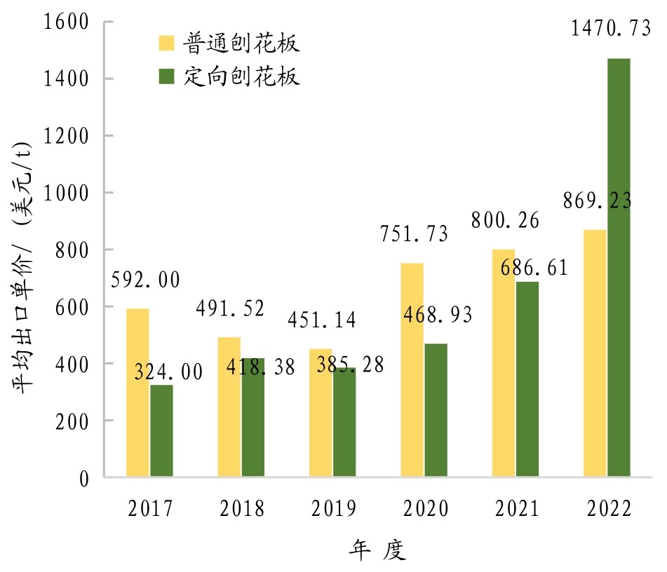 中国出口的各类刨花板产品,平均出口单价均呈增长趋势(图8)。据统计,2022年之前普通刨花板平均出口单价高于定向刨花板,这主要是由于中国出口的普通刨花板产品一般都经过二次加工,而出口的定向刨花板多为素板,且部分是用于货运包装方面,售价相对较低,因此普通刨花板平均出口单价会高于定向刨花板。2022年定向刨花板平均出口单价大幅提高,由2021年的686.61美元/t提高到2022年的1 470.73美元/t,增幅114.20%,可能是由于2022年定向刨花板国际上供不应求,导致价格陡增。对比各类刨花板平均进口单价,中国刨花板产品平均出口单价远高于平均进口单价。
