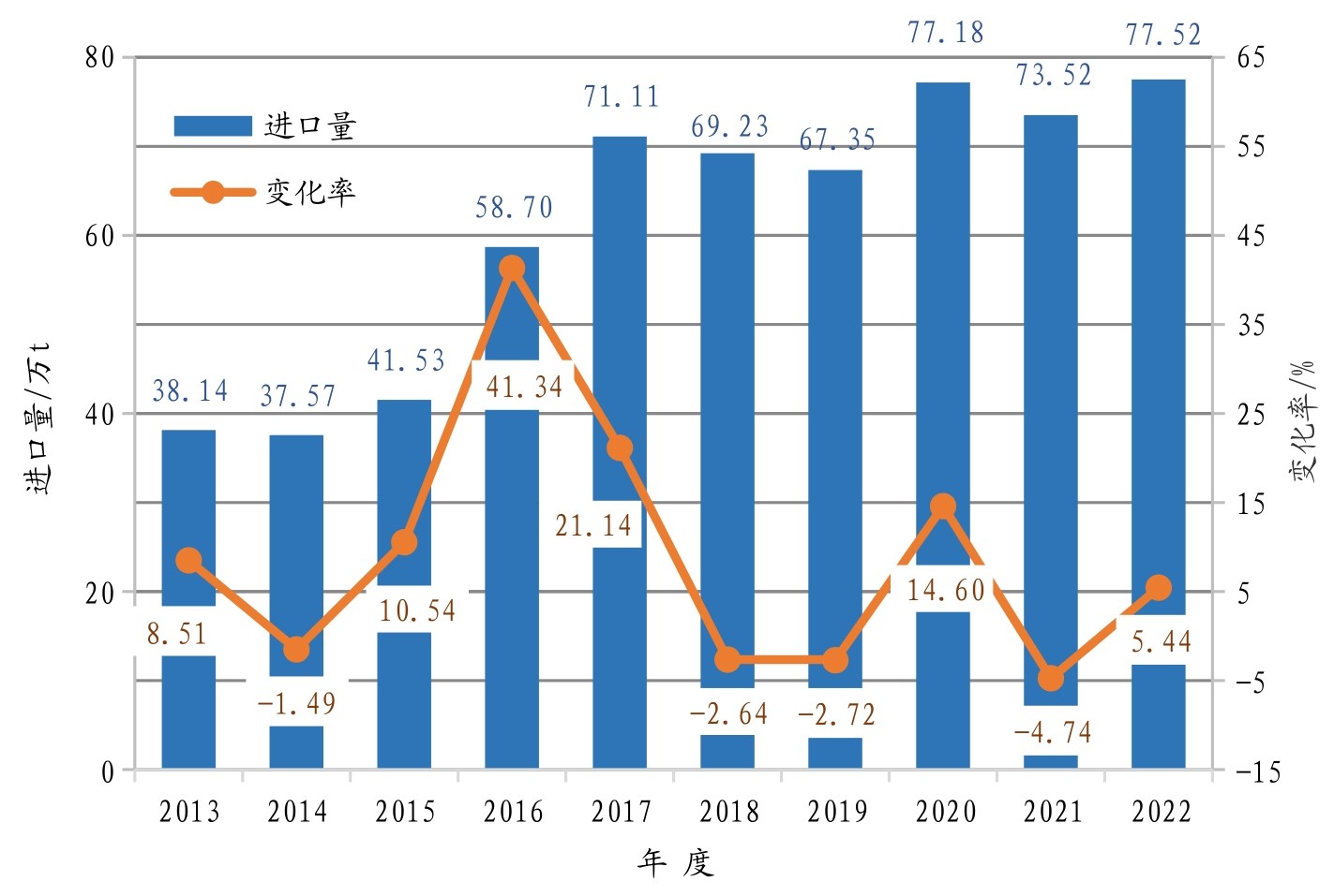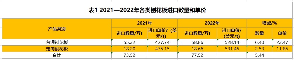 2022年中国刨花板进口量为77.52万t,同比上年增长了5.44%;进口金额4.10亿美元,同比上年增长了26.93%。综合分析,2022年中国刨花板呈现进口量、进口金额齐增,且进口金额增幅超过进口量。
