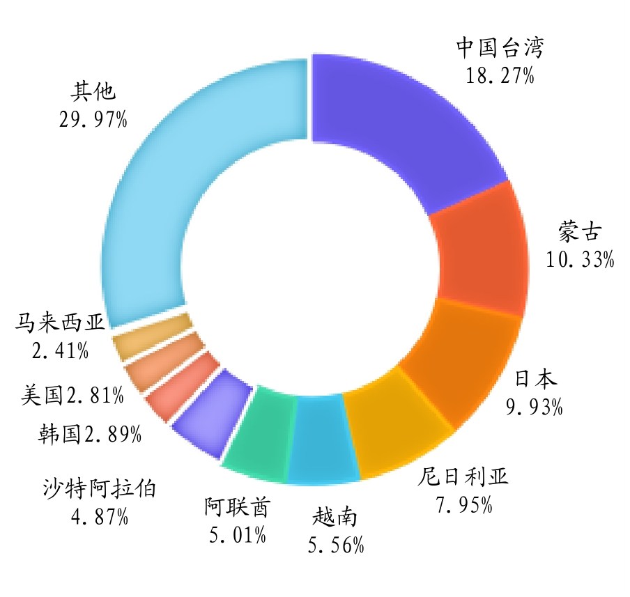 中国台湾是中国大陆最 大的刨花板出口市场,占中国出口总量的18.27%,其次是蒙古(10.33%)、日本(9.93%)、尼日利亚(7.95%)、越南(5.56%)、阿联酋(5.01%)、沙特阿拉伯(4.87%)、韩国(2.89%)、美国(2.81%)、马来西亚(2.41%),其他国家/地区占29.97%,见图9所示。