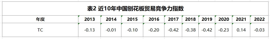 近10年中国刨花板贸易竞争力指数见表2,除2021年为0.14,其余各年基本为负数,这是由于一直以来中国刨花板市场以内销为主,出口较少,且进口量大于出口量。随着中国刨花板产能和品质大幅提升,中国刨花板应充分利用国际国内两个市场,两种资源优势,促进双循环,拉动行业发展。