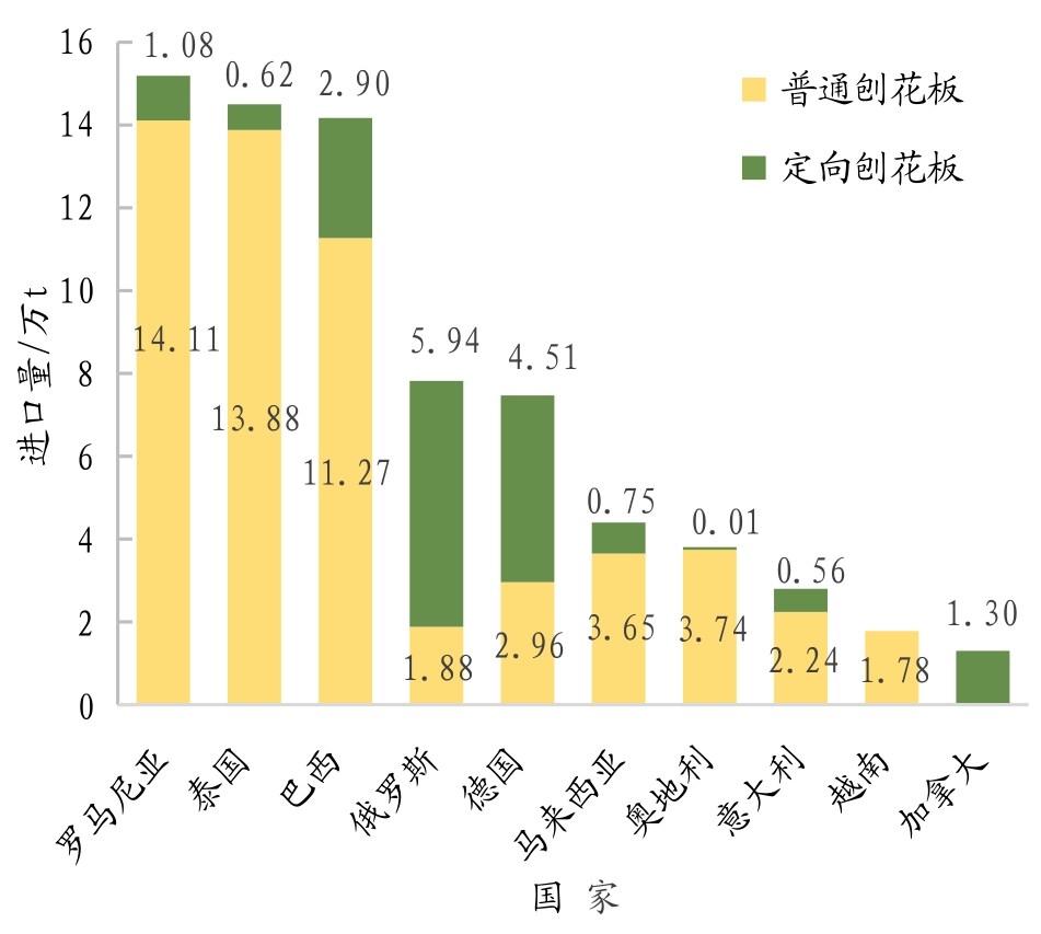 进口量排名前10位的国家进口产品类别,如图4所示。中国主要从罗马尼亚、泰国、巴西、马来西亚、奥地利、越南和德国进口普通刨花板。定向刨花板主要来自俄罗斯、德国、巴西和加拿大,少量来自罗马尼亚、泰国、马来西亚和意大利。