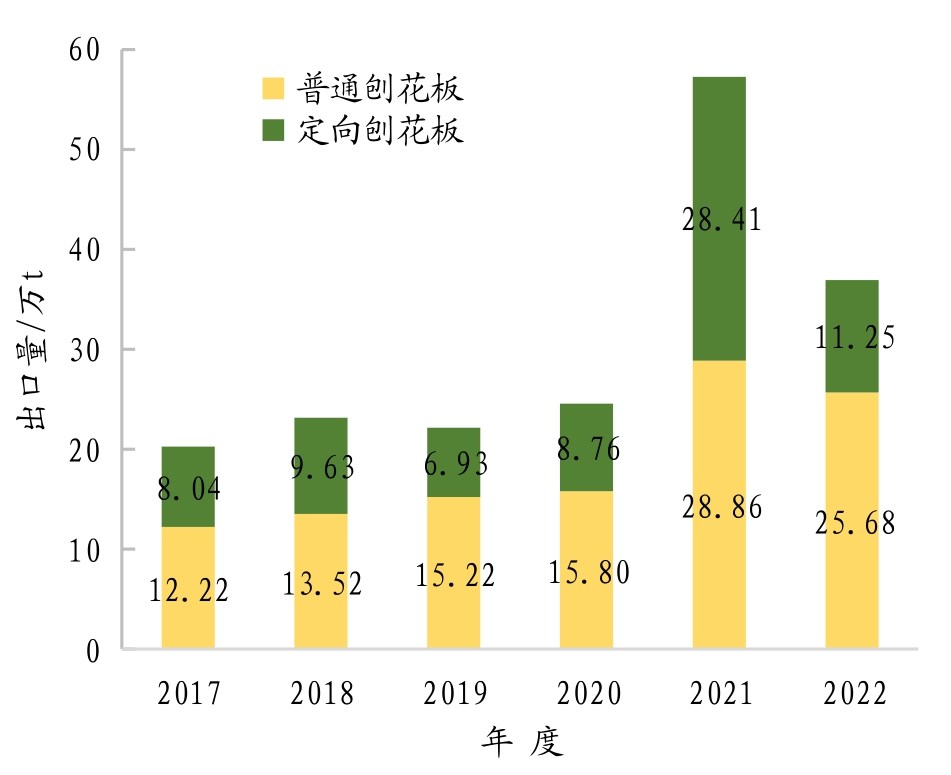 中国出口刨花板产品见图7,整体上普通刨花板出口处于主导地位,近两年年均出口量大幅增加,均超过25万t;定向刨花板出口量2021年出现爆发式增长后,2022年有所回归,但相比2020年出口量依然是增长态势。