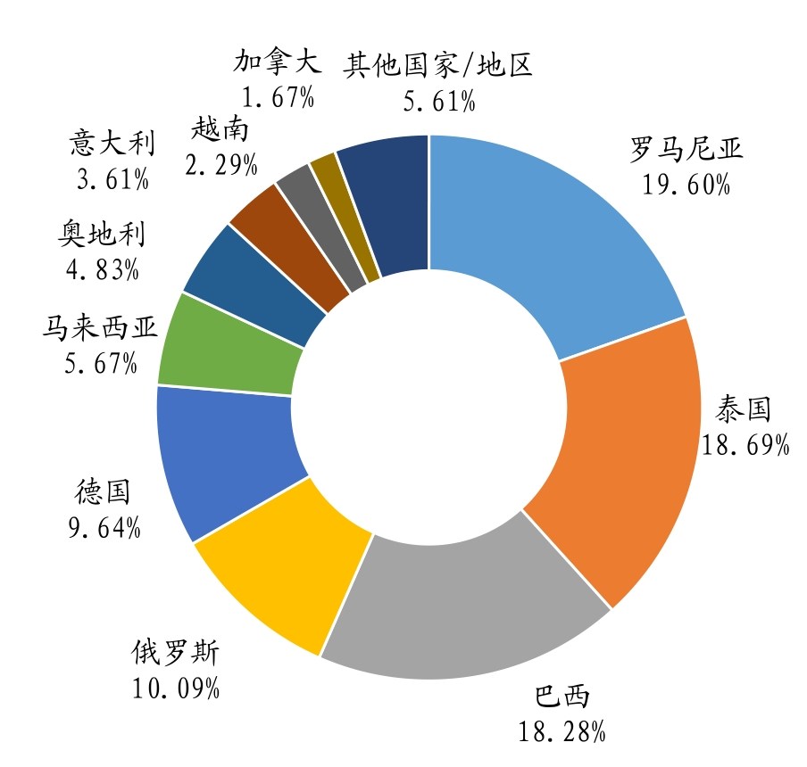 罗马尼亚是中国最 大的刨花板进口国,占进口总量的19.60%,其次是泰国(18.69%)、巴西(18.28%)、俄罗斯(10.09%)、德国(9.64%)、马来西亚(5.67%)、奥地利(4.83%)、意大利(3.61%)、越南(2.29%)、加拿大(1.67%),其他国家/地区占5.61%,如图3所示。