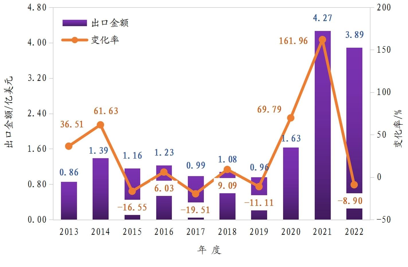 分析期(2013—2022年)内中国刨花板出口金额变化趋势与出口量变化趋势基本一致,但是2022年较往年发生了明显变化,见图6所示。2022年中国刨花板出口金额为3.89亿美元,同比上年降幅达到8.90%,出口量降幅远高于出口金额降幅,平均出口单价升高。