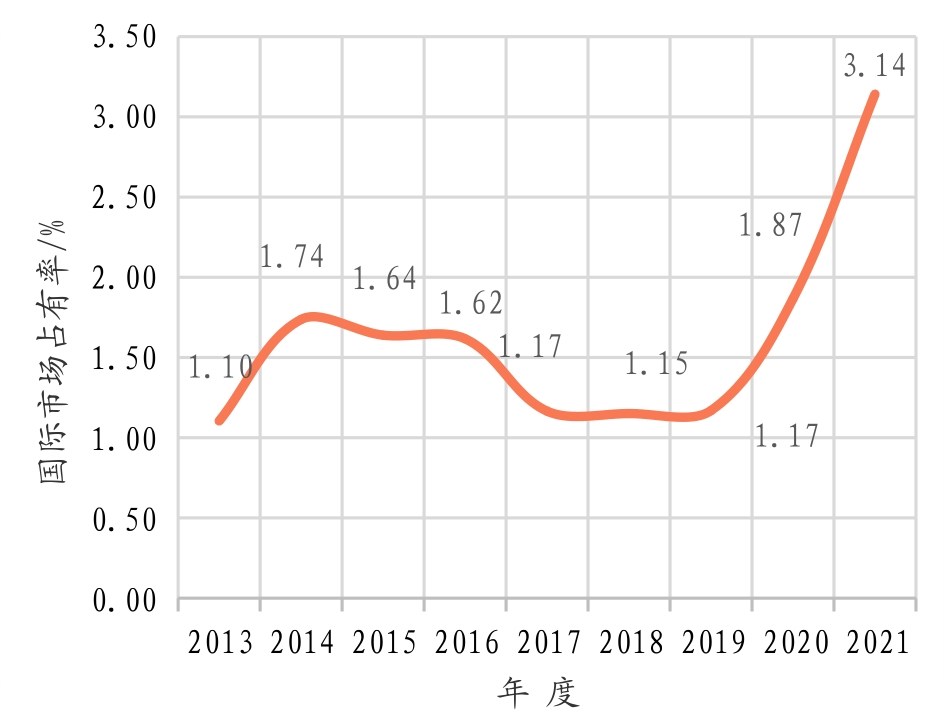 中国刨花板的国际市场占有率见图11,2013—2018年占有率在1.0%~2%区间波动,2019以来中国刨花板的国际市场占有率增速显著,2022年达到了3.14%。随着中国刨花板产业发展,刨花板产品品质极大的提升,逐渐受到国际市场认可,国际贸易会成为新的增长点。