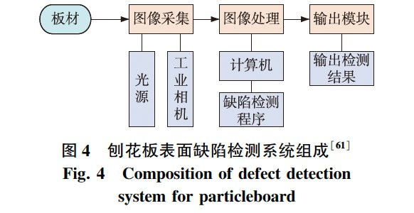 在生产过程中,由于设备、工艺、环境、材料等因素的影响,人造板产品表面会出现不同种类的缺陷,如油污、胶斑、大刨花、裂痕、边角破损等。人造板缺陷不仅影响着板材外观、性能和质量,还不利于二次加工和企业的经济效益; 因此,通过开发智能检测系统代替人工检测以实现产品缺陷的快速和精准检测,也是人造板智能制造的重要研究方向。魏智锋等基于深度学习构建了SSD-MobileNet算法模型用于人造板的缺陷检测,有效提升了对板材产品可能出现的粗刨花、水印、砂痕、杂物、胶斑等缺陷的检测精度和速度。高鹏威等开发了一种基于线阵相机和改进CenterMask算法的中密度纤维板表面缺陷实时检测系统,提高了缺陷识别的准确率。为了准确定位缺陷,达到企业生产所要求的检测精度和检测速度,郭慧等开发了基于机器视觉的刨花板表面缺陷检测系统,其组成如图4所示。