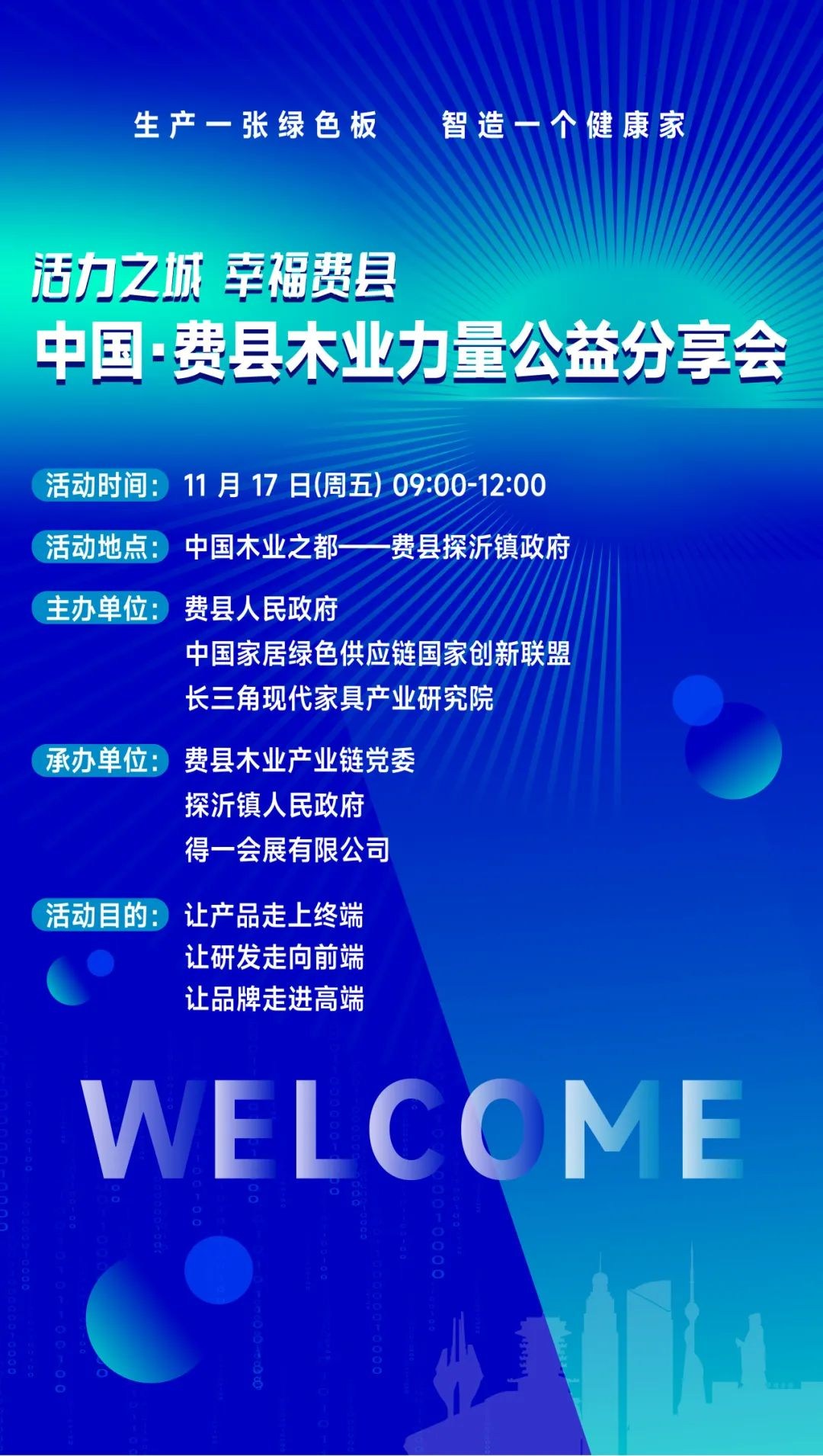 由费县人民政府、中国家居绿色供应链国家创新联盟、长三角现代家具产业研究院主办,费县木业产业链党委、探沂镇人民政府、得一会展有限公司承办的中国·费县木业力量公益分享会,将于11月17日上午9:00在中国木业之都—探沂镇举办。