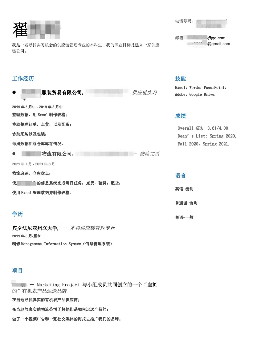 建议将“工作经历”修改为“实习经历”的表述,否则容易让HR分不清该经历是否为正式工作经历,实习经历记得由近及远去书写,HR会更希望看到你近期的一个职业动态;同时,实习经历目前书写的较为笼统,没有凸显自己个人的产出和结果,其实可以使用“动宾+产出”的语句结构来书写,比如在实习期间负责公司哪些【SKU】的物流追踪,仓库盘点工作,期间独立完成【多少数量的SKU】的月度/季度盘点等等,尽量用数字去量化具体的产出